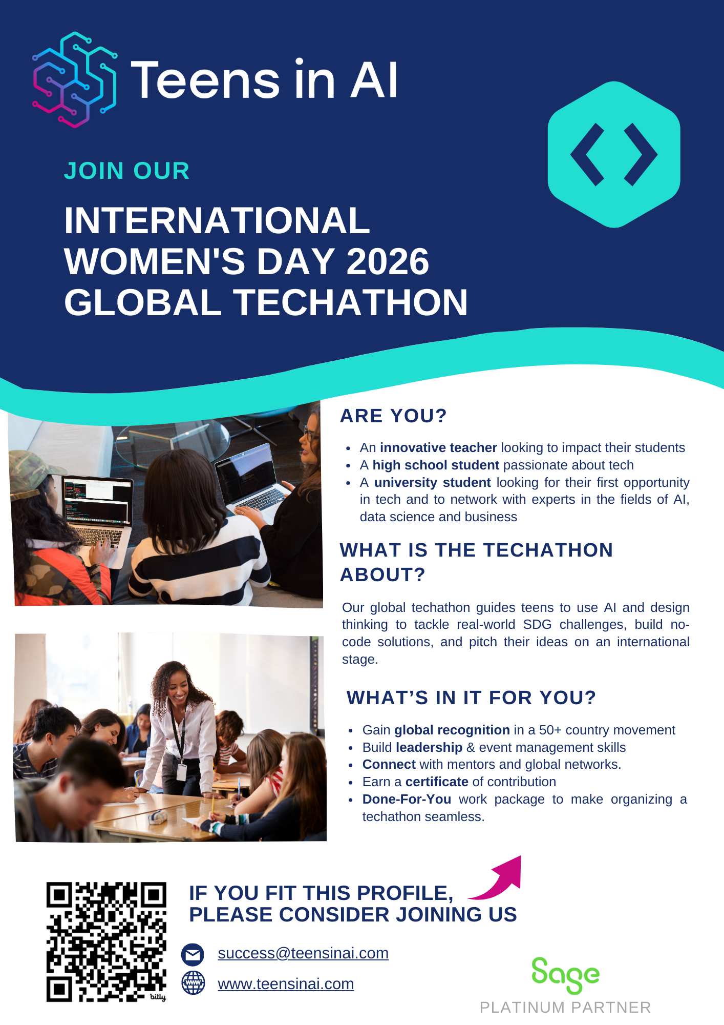 The IWD 2026 Global Techathon, hosted by Teens in AI, is a three-month global initiative (January - April 2026) designed to inspire and empower young people aged 12β18 to explore Artificial Intelligence as a tool for social good.