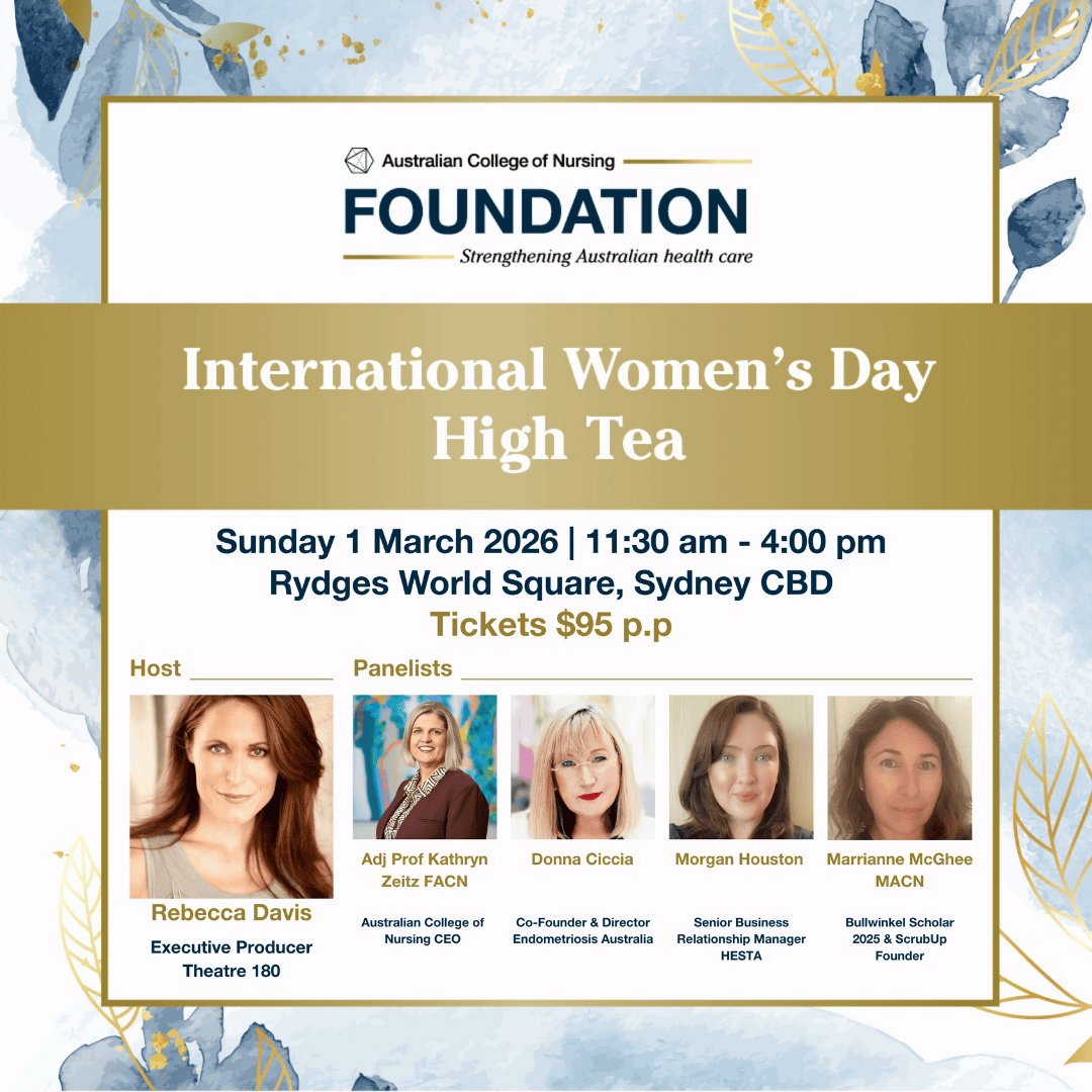 Join us on Sunday, 1 March 2026, at Rydges World Square, Sydney, for the Australian College of Nursing (ACN) Foundation's International Women's Day High Tea - an elegant celebration of empowerment, legacy, and the vital contribution of women to the nursing profession.
