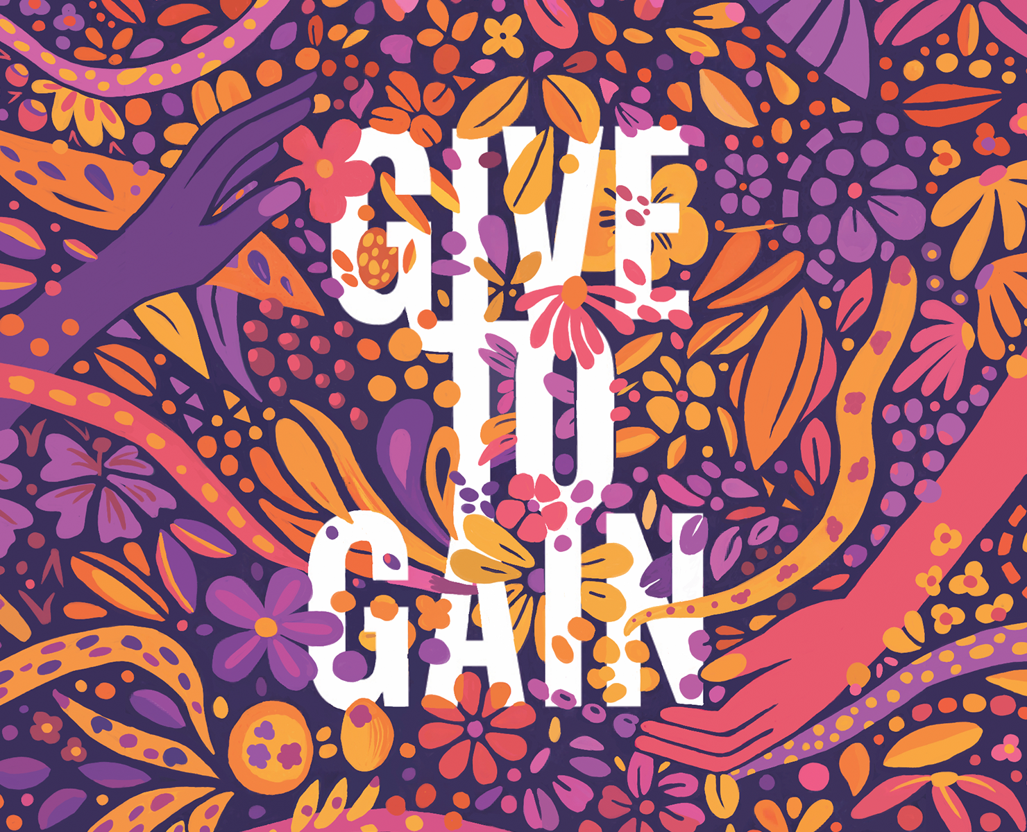 "My botanical design explores generosity creating growth, where shared energy is given freely to expand communities and connections. It's a reminder to recognise our collective strength, to advocate for, and contribute to, equity, and to celebrate each other's progress," says Tania. "The hands represent offering/receiving, and the layered botanicals symbolise what flourishes when we support each other. It’s about shared energy - when something is given freely, our communities and connections expand."