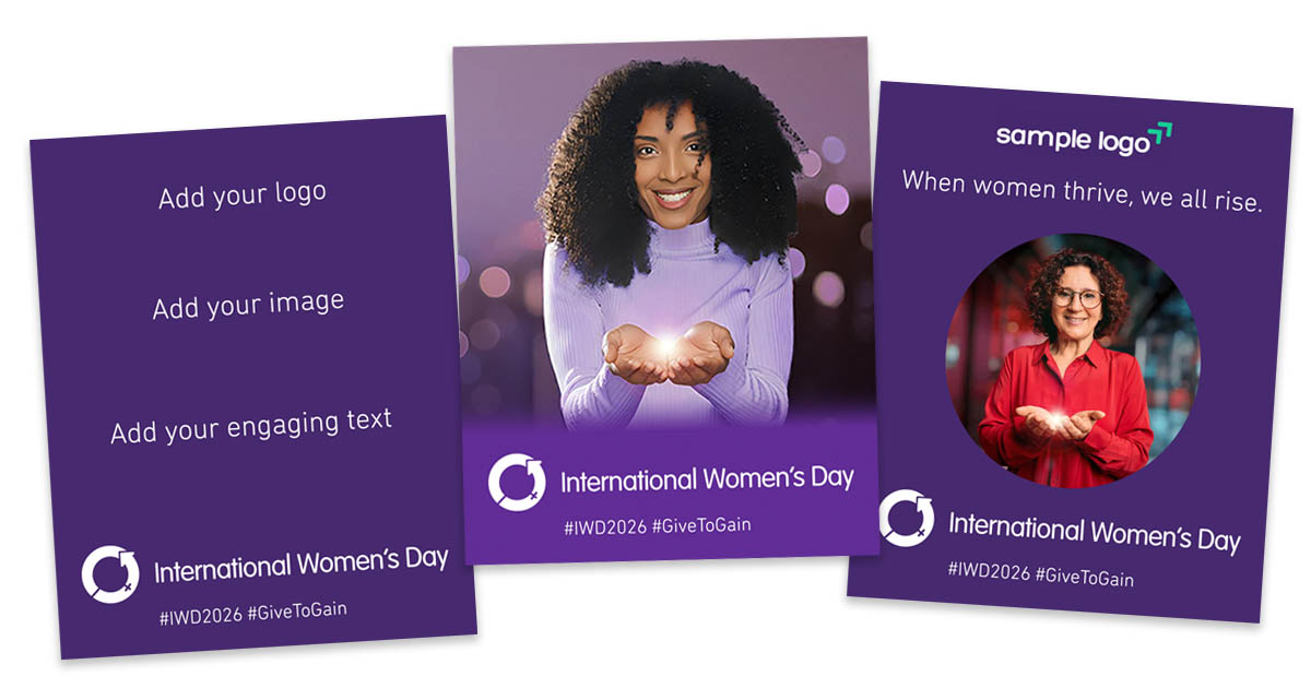 Co-brand IWD social media cards with your own logo, add in your text, insert an image. Then post on social media using #IWD2026 #GiveToGain.