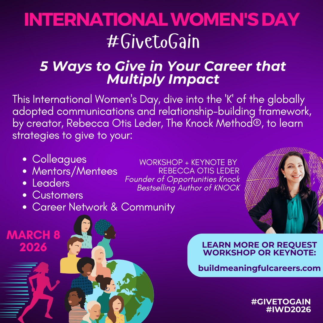This International Women's Day, dive into the 'K' of the globally adopted communications and relationship-building framework, by creator, Rebecca Otis Leder, The Knock Method®, to learn strategies to give to your colleagues, mentors, leaders, customers, and your career network.