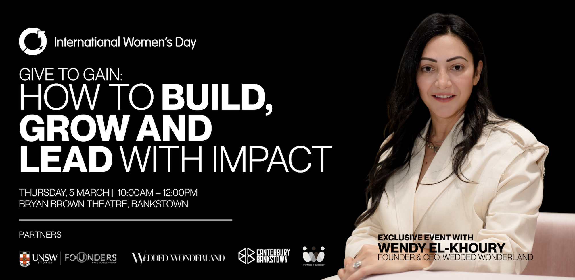 In celebration of International Women’s Day, UNSW Founders, City of Canterbury Bankstown and Wedded Wonderland invite you to a practical and inspiring morning with Wendy El-Khoury, Founder and CEO of Wedded Wonderland and Wonder Group.