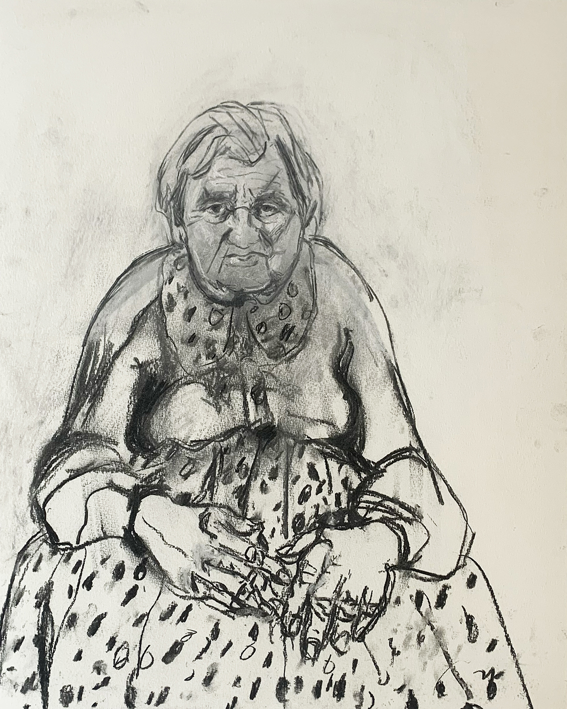 All of Suganami’s subjects are placed at the centre of the painting, as is customary in classical portraiture, where the sitter is in the spotlight, to be painted and recorded - and remembered. There are a few hints of traditional dress - the shawl, a striped cloth or an apron, but the fine detail of the painting is in the skin, with the faces and hands in laps drawing attention.