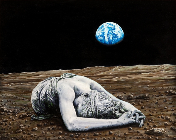 Artemis, the Greek Goddess of the Moon, is depicted in a modern technical landscape of the Moon. Collectively we have forgotten the ancient view of the Moon as remote, female, and revered.