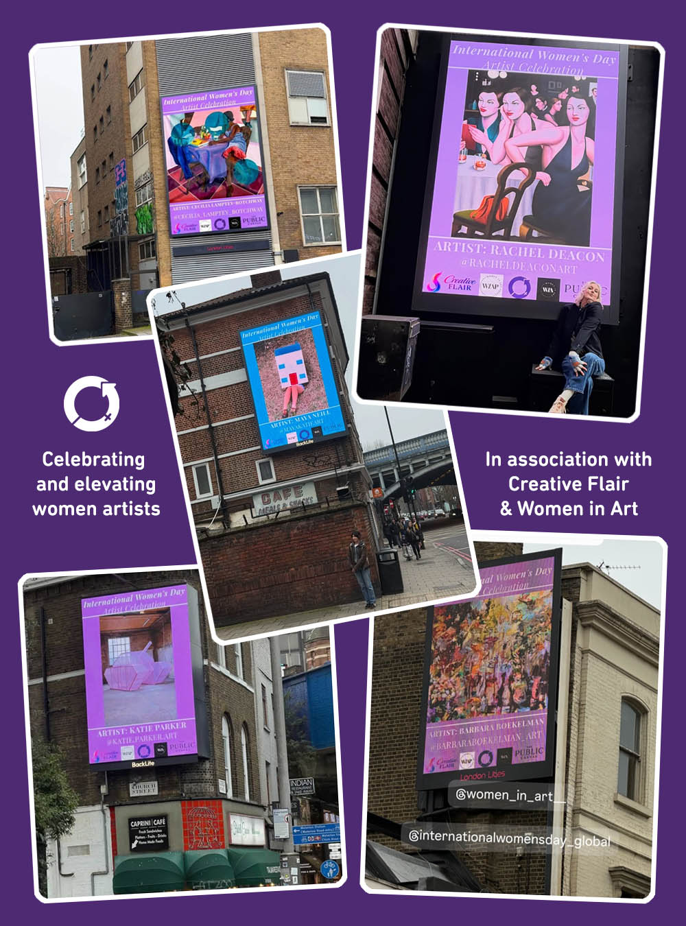 The winning work of five women artists, as judged by Women in Art, took over a series of digital billboards in London, UK throughout the IWD period, highlighting women's visibility, representation, and narrative in outdoor space. The selected artworks appeared repeatedly on digital screens along major routes near London’s busiest cultural hubs. Each piece was seen multiple times per hour, transforming a traditionally commercial environment into a site of celebration, reflection, and representation. Hear more about the women artists and their fabulous work here.